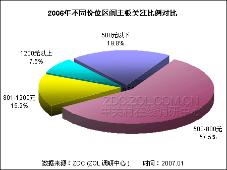可以表明,2006年主板市场的主流价位区间同2005年完全一致,仍是500-800元产品占据大半市场,不同的是500元以下市场开始萎靡,关注比例仅占到整市场的1/5左右。