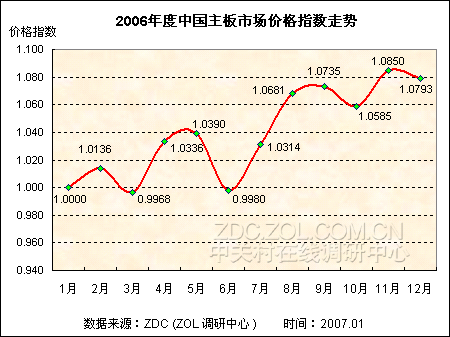 据ZDC统计显示,2006年整个主板市场的价格指数上扬7.9个百分点,呈现出波浪式上涨趋势。在上半年,主板市场的价格指数波动剧烈,但并没有产生增幅,甚至还在6月份出现了0.2个百分点的降幅。但从下半年开始,主板市场的价格指数持续上升,经历了9月、10月的小幅波动后,至11月,主板市场的增幅达到最高值,为8.5%;至12月,整个市场的价格指数又回落了0.6个百分点。