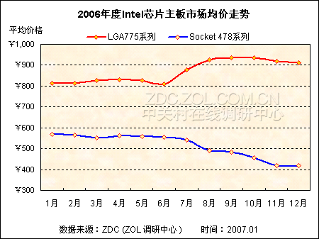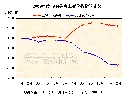 调查显示,2006年LGA775平台和Socket478平台表现出截然不同的价格走势。其中,LGA775平台的价格指数呈增长态势,而Socket478的价格指数则大幅下滑。