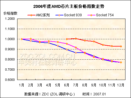 同Intel中的Socket478平台一样,Socket939和Socket754平台也难以摆脱技术淘汰的命运,产品均价开始一路走低。同2006年1月份相比,Socket939产品的均价从830元降至640元,Socket754产品的均价从575元减少到444元。