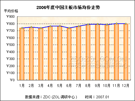 调查显示,整个主板市场的平均价位一直处于700-800元之间。从2006年度的均价走势上看,用户所关注的价位不断走高,并在11月份首次达到了803元。但进入12月份,市场均价又落入到800元以内。