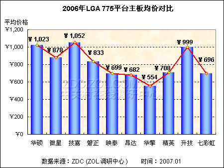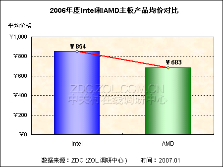 在2006年度中,AMD倾力推出的AM2平台价格小降,LGA775平台由于多款高端产品的推出而引起市场均价上扬,而两者的上一代产品Socket478平台和Socket754平台却分别出现了26.5%和22.8%的高降幅。在2007年,ZDC预测LGA775与AM2主板将进入最激烈的市场竞争阶段,降价幅度必然增大;相对而言,由于其上一代产品在2006年下半年已经提前出现了高降幅,利润空间再次压缩,因而价格走向应当逐渐趋缓。