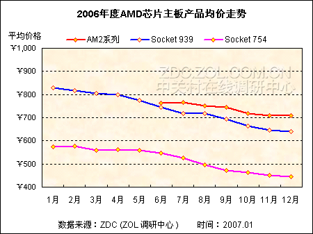 SocketAM2平台从入门级到高端产品,是为全面取代Socket939和Socket754平台而设计。在2006年6月份,SocketAM2平台的均价是762元,随着时间的推移,其市场均价持续走低;至12月份,SocketAM2平台的均价已降至708元。