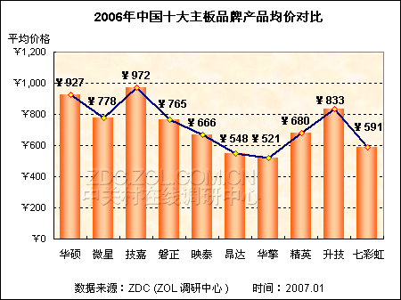 调查显示,技嘉和华硕的产品均价分别高达972元和927元,明显高出了800元这个普通用户的心理承受价位。微星的市场均价比较适中,为778元。精英比较例外,其价格定位甚至要低于二线品牌,其在本年度的产品均价是680元。