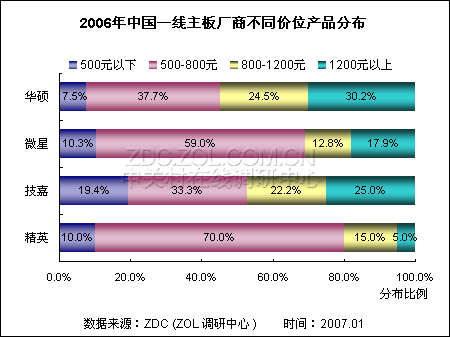 调查显示,华硕和技嘉十分重视高端市场,产品数量分别占到各自产品线的30.2%和25.0%,在之前的调查中,两者的市场均价明显高于其它厂商也就在此找到了原因。在800-1200元的中高端市场,华硕和技嘉的产品分布也都超过了自身产品线的20%。而在用户最为关注的500-800元中端市场,两者的产品分布都在40%以内。