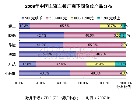 调查显示,华擎、昂达和七彩虹以中端和低端产品为主,其中华擎最贵的产品不足800元,800元以上的昂达和七彩虹产品也极其稀少,所占比例均不到各自产品线的5%。映泰在中高端市场上的产品也比较少见,所占比例不足其产品总数的10%,而在500-800元和500元以下市场,映泰的产品分布分别占其产品总数的48.5%和42.4%。