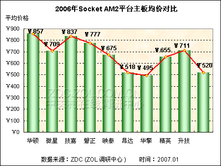 调查显示,华硕在AM2平台的产品均价最高,为857元;其次是技嘉,产品均价低于华硕20元,为837元。除这两家品牌外,其它品牌的产品均价都不到800元。