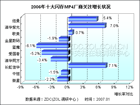 调查结果显示,2006年最受用户关注的十大闪存MP4厂商当中,仅有四家厂商关注度保持正增长,其中长虹佳华表现最为突出,关注比例增长幅度达到7个百分点以上,清华同方以0.1个百分点的微弱劣势随后。纽曼以5.4个百分点的正增长幅度处于第三位,此外还有歌美保持正增长态势,但是增长幅度不及1个百分点。