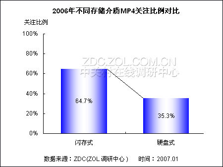 调查结果显示,在2006年度闪存式MP4占据近三分之二的关注比例。而硬盘式MP4的市场关注度保持在35.3%,与闪存式MP4关注比例悬殊近30个百分点。