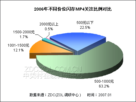 数据显示,在2006年度500-1000元之间的MP4最为走俏,以63.2%的关注比例在闪存MP4市场上占据主流地位。其次是500元以下产品,占据22.5%的关注比例。1001-1500元在闪存MP4市场上处于中高端机型,获得12.1%的关注比例。高端1500元以上产品关注比例较低,累计不足3个百分点。总的来看,在不同价位的闪存MP4市场上,关注比例分布处于高度集中的状态。