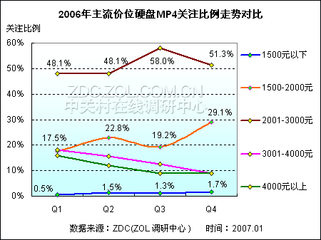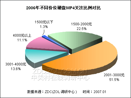 1500元以下产品虽然具有价格优势,但是在硬盘式MP4市场上的关注比例较低,不及2个百分点。从这一数据分布状况来看,ZDC认为低端1500元以下的硬盘MP4在2007年市场上难以普及,2001-3000元之间的产品主流地位难以撼动。