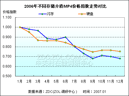 从价格指数走势来看,在1月至6月这一时间段中,硬盘式MP4降幅相对突出,但是从下半年开始,闪存式MP4出现较大的价格波动幅度,导致下半年降幅不及闪存式MP4播放器。