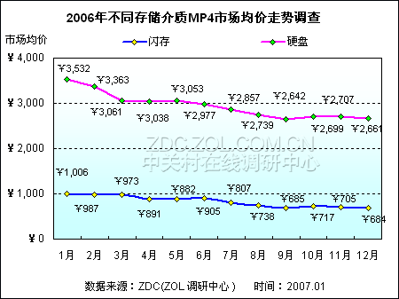 随着竞争的激烈,MP4市场在2006年价格战表现较为突出。其中,硬盘式MP4播放器市场均价在年底已经降至2661元,同比年初下跌超过800元。闪存式MP4播放器市场均价则由1月份的1006元跌至12月份的684元,整体下滑幅度为322元。