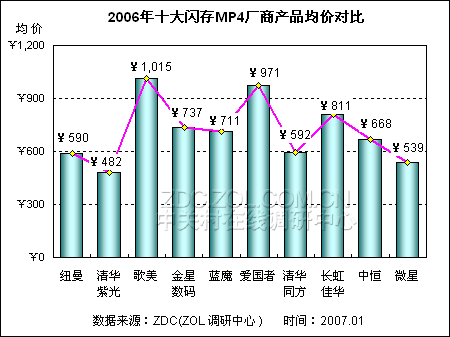 调查显示,在最受用户关注的十大闪存式MP4播放器厂商当中,清华紫光产品均价最低,为482元。相比之下,歌美则成为这十家厂商中产品均价最高的厂商,达到1015元。随后的是爱国者,市场均价达到971元。