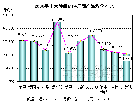 (图)2006年十大硬盘式MP4厂商产品均价对比