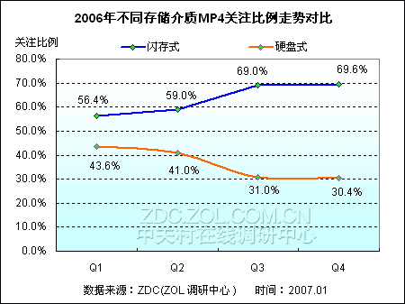 调查显示,虽然厂商在市场上推广硬盘式MP4的呼声较高,但是在2006年的关注度调查中显示,硬盘式MP4市场关注度却成下滑的势头。而于此同时,闪存式MP4市场关注度则由第一季度的56.4%上升至第四季度的69.6%,逐渐把守了整体市场三分之二以上的比例。