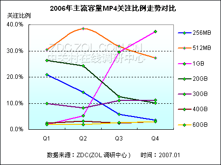 调查显示,当前MP4市场上产品容量分布较为分散,但是整体相比之下闪存式MP4占据优势。在主流的闪存式MP4产品当中,256MB与512MB产品关注比例走势均呈现出大幅度下滑的态势。仅有容量为1GB的产品关注比例直线上扬,并在Q4关注比例接近40个百分点。