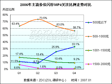 从这一关注比例走势来看,闪存式MP4仍是2007年的市场重点,市场主流向硬盘式MP4市场过渡的时间被延长,并且在2007年硬盘式MP4市场关注仍将处于下锋。