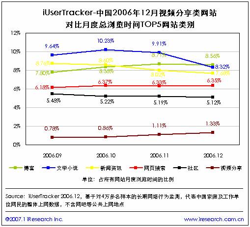 根据艾瑞最新推出的网民连续用户行为研究系统iUserTracker的最新数据表示,2006年9-12月,视频分享类网站月度总浏览时间占所有网站的比例有明显上升趋势,文学小说和新闻资讯处下降趋势。2006年12月,月度总浏览时间TOP5网站类别分别是博客、文学小说、新闻资讯、网页搜索和社区。