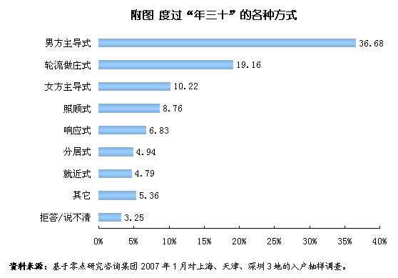 本次调查结果显示,昔日在男方家中团圆守岁的传统,正在让位于五花八门的过年方式。36.68%的家庭仍然坚持“年三十在男方父母家”这一传统习俗,但有10.22%的家庭会在女方家度过除夕。此外还有多种多样的过年方式:19.16%的家庭选择了“一年一家,轮流做庄”的方式;8.76%的家庭根据实际情况,选择到平时相对走动较少、或身体不好、或经济条件较差的一方父母家过年;4.94%的家庭选择了各回各家的“分居过年”的方式。这样的变化在80后的年轻夫妇身上更加明显。80后的年轻夫妇选择年三十在男方父母家过节的比例明显低于六七十年年代的夫妇,而选择“分居式”和“轮流做庄式”的过年方式则多于六七十年年代的夫妇。多样的过年方式表明流行几千年的以男方家庭为主的传统观念逐渐松动。