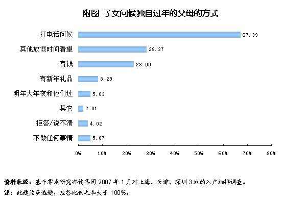 对于没有子女陪伴单独过年的另一方父母,有近七成的人选择了打电话问候的方式(67.39%);选择日后探望的占33.4%。80后的年轻夫妇选择电话问候的比例更高,达到78.12%;而选择日后探望的比例仅为21.45%。信息社会的快速沟通一方面使我们的交流变得更便捷,能够对远在异乡独自过年的父母做出补偿,但是另一方面又使越来越多的年轻人更加依赖于这种方式,和父母直接面对面的交流减少很多,而面对面的交流是其他沟通方式不可替代的。