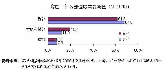 现代社会以脑力劳动为主的工作生活方式造成人们运动量的急速减少。一些比较容易囤积脂肪而又十分影响体形美观的部位就成为了人们减肥的重点。调查结果显示,局部的肥胖和臃肿是困扰大多数人的问题。针对那些认为有必要减肥的人来说,减肥的过程和部位是有主有次的。6成以上的受访者表示腹部是自己最想瘦身的部位。此外,另有一部分的受访者急切希望自己的大腿和腰部能变得更加纤细。有趣的是,调查中还发现,男性和女性对身体不同部位减肥的愿望强烈程度是存在差异的,其中男性比女性减腹部的愿望更强烈,而女性比男性减大腿和臀部的愿望更强烈。