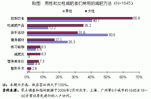 由于肥胖已经成为一个比较普遍的问题并妨碍着人们的日常生活,各种各样的减肥手段便应运而生。从传统的节食减肥到新兴的减肥食品,从缓慢见效的运动减肥到立竿见影的整形手术,正在被不同的减肥需求者所追捧。总的来说,控制饮食、吃减肥产品、徒手运动、使用健身器材这些比较传统的方法仍是人们最常用的减肥手段。然而,男性和女性的减肥方法却有一定的差别:控制饮食(65.8%)这种比较柔性的方法是女性最常用的减肥手段;男性减肥者则对徒手运动(50.5%)最为热衷。