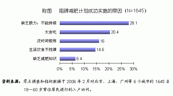由于各种各样的因素,减肥的过程显得并不那么轻松。在我们的周围,似乎总有那么一群人,每天把减肥放在嘴边,却又不见成效。究竟是什么阻碍了人们减肥计划的成功实施呢?从调查中发现,近三成的人表示缺乏毅力、不能持续是造成减肥计划过程中的主要障碍;此外,太贪吃(20.4%)和没时间锻炼(16%)也是肥胖难以控制的原因。
