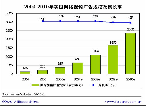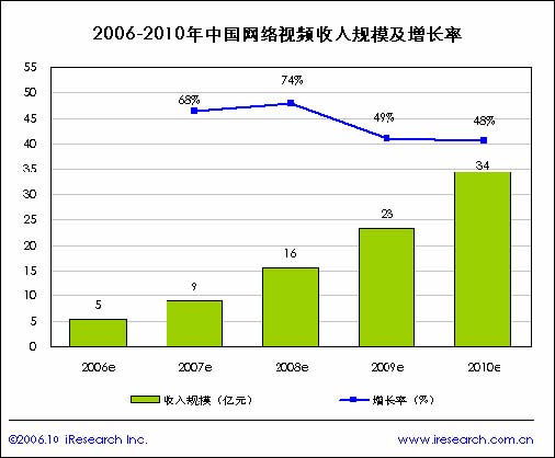 艾瑞统计2006年网络视频收入总规模为5亿元,预计2010年达到34亿元。复合年增长率为60%左右。
