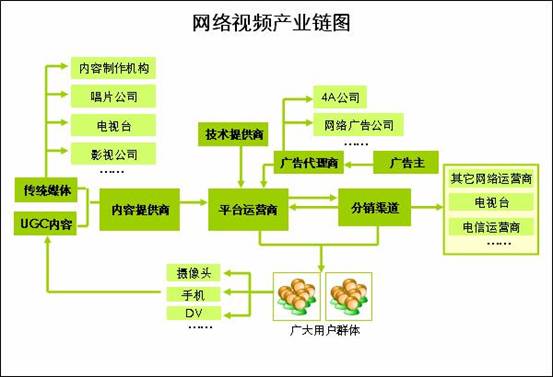 网络视频产业目前属于起步阶段,产业链只是初步形成轮廓。在网络视频产业链中,参与者众多,发展迅速,同时竞争也较为激烈,形成了一条内容提供商、网络平台运营商、技术提供商、分销渠道、广告主、用户等为主要构成的网络视频产业链雏形。