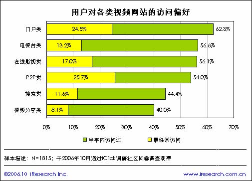 门户类、在线影视类和电视台类视频网站历史一般比较长,拥有坚实的用户资源基础,因而在用户访问覆盖程度上具有一定的优势。但部分此类网站的视频相关服务(如新浪、搜狐的P2P直播、视频互动分享)大多也是在今年刚推出,所以在用户方面的领先优势不是很明显。