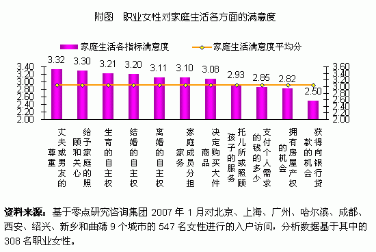在现代都市里,许多职业女性和男性一样在事业上取得了巨大成功,但是,由于性别的影响,她们往往要面对一些额外的压力,其中之一就是如何寻找家庭和事业之间的平衡。因此,家庭和事业如何共同影响职业女性的生活质量逐渐成为人们关注的话题。一项来自零点研究咨询集团的最新调查发现,一方面,职业女性在家庭生活中普遍获得配偶的尊重以及婚育的自主权力,这大大提升了她们的生活满意度;但是,另一方面,职业女性对于自己支配财富的能力以及自己的职业状况并不满意,而这对于职业女性总体生活感受具有明显的下拉作用。