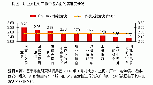 由于性别因素,职业女性在职场提升过程中,往往比男性有更多的来自自身的、家庭的或者是社会的障碍。总体上看,职业女性对职业状况的满意度显著低于对家庭生活的满意度(比较总体平均分)。这也反映了职业女性在事业发展上面临了比家庭生活更多的麻烦和困惑。具体看职业女性对职场生活中各个纬度的评价发现,得分最高的是同事的尊敬。这说明职业女性在与男性“同场”竞技中,普遍获得了同事(包括男性同事和女性同事)们的尊重。但是,职业女性对于自己所能获得的“创业机会”、工作中的晋升机会以及工资报酬这几个方面的满意度却明显偏低。这可能反映了性别因素在职场上的影响作用依然较大,女性由于自身的局限性以及社会上长期存在的偏见可能受到了不公正的待遇,进而导致她们在这些方面的满意度较低。这些说明,对于女性来说,“职场天花板效应”依然一定程度上存在。
