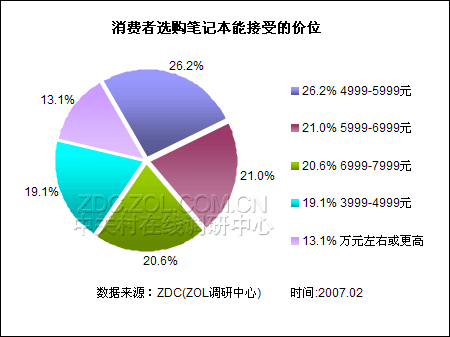 调查显示,能接受4999-5999元之间笔记本的消费者所占比例最多,达到了26.2%。这主要是由于4999-5999元的笔记本提供了相对出色的配置及功能,已经能满足学生用户基本的应用需求。此外,该价位产品也更加符合学生的消费水平,各大厂商在此价位段的机型分布也更为密集。
