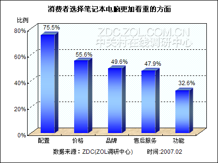 总的来看,得益于笔记本市场产品价格的迅速走低以及推广力度的加大,学生购买笔记本的用户逐步增多,并且该市场拥有较大的发展潜力。而在不断成熟的笔记本市场环境中,消费者的消费行为更趋向理性化,3/4以上的用户将配置作为最看重的一大因素,而对价格和品牌等因素关注程度降低。