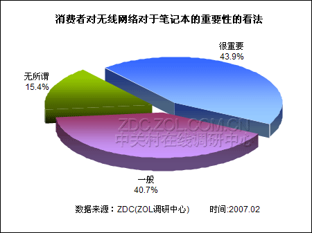 目前,无线网络应用环境越来越好。从消费者对无线网络的重要性看,有多达43.9%的用户认为无线网络对于笔记本很重要。40.7%的用户认为无线网络对于笔记本重要性一般,仅有15.4%的用户认为无所谓。