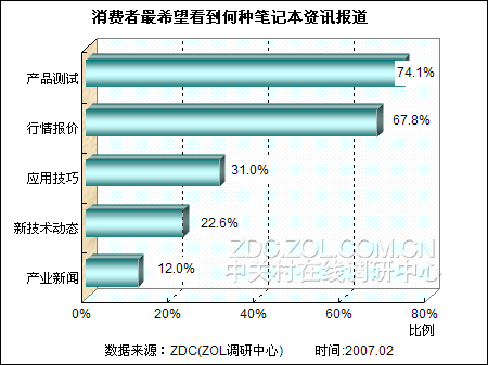 调查显示,多达74.1%的消费者最希望看到笔记本产品测试的资讯报道。其次是行情报价,有67.8%的用户最希望看到此类资讯报道。笔记本应用技巧与新技术动态分别占据了31.0%与22.6%的比例。相比之下,最希望看到产品新闻的用户所占比例最少,仅有12.0%。