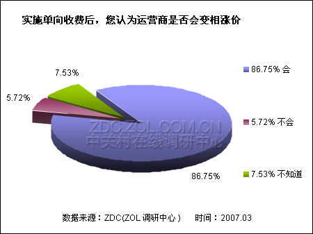 2007年2月,移动倡导单向收费使得这一话题成为消费者关注的焦点。为进一步了解单向收费在市场上的运行状况,ZDC从运营商和消费者两个角度进行调查。结果显示:
