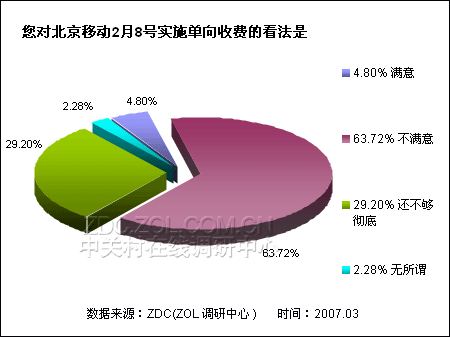 北京移动在2月8号实施单向收费举措,但是超过六成以上的用户对这一措施并不满意。近三成的消费者认为,仅仅单向收费这一举措实施的并不彻底。持满意和无所谓态度的用户分别占据4.5%与2.28%的比例。