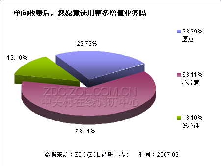 单向收费措施实施以后,运营商相应也推广了一些数据增值业务以及其他套餐业务。对于这些增值业务的调查结果显示,63%以上的用户表示不原意选择更多的增值业务。这一方面反映了运营商增值业务在市场上并不是很吃香,另一方面也反映了降低话费开支才是消费者最为关注的方面。