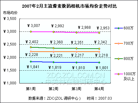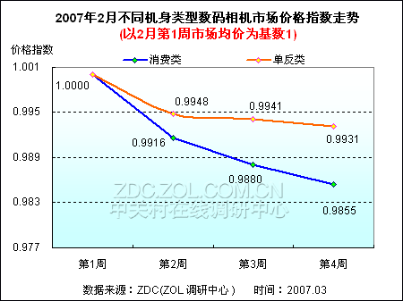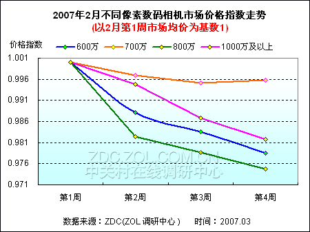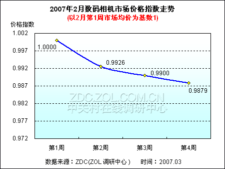 2007年2月,市场消费重点的转移导致2月份数码相机市场价格走势平平,截至2月第4周,整体市场价格指数仅出现1.21个百分点的波动幅度。