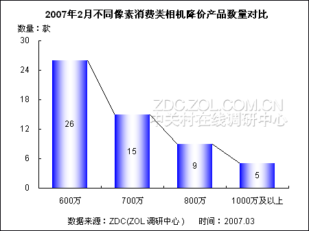 调查结果显示,600万像素产品是市场降价的主力机型,26款产品出现价格下调,占据此类产品总量的四成以上。据ZDC的关注调查显示,目前600万像素产品已经退居二线,将市场主流地位让与更高像素机型,这是导致其降价产品数量较多的重要因素。