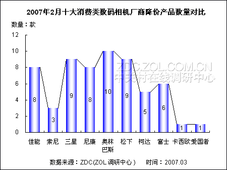 (图)2007年2月十大消费类数码相机场上降价产品数量对比