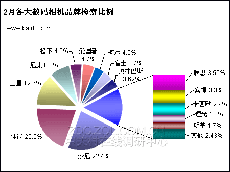 从上图可以发现,消费类数码相机与单反类数量相机关注比例悬殊80个百分点以上。且与1月份相比,2月消费类数码相机在市场上的关注度仍呈现出增长的势头。而单反数码相机在市场上的关注比例则出现1个百分点的降幅。