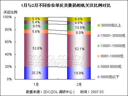 对比结果显示,8000元成为中高端与低端入门单反数码相机在价位区间上的分水岭。且与1月份相比,8000元以上产品关注比例出现2个百分点的增长幅度,而8000元以下产品关注比例则相应下跌2个百分点。