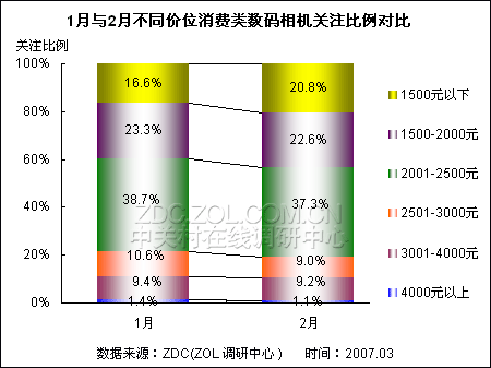 调查结果显示,2007年2月1500元以下消费类数码相机市场关注出现大幅度增长,而其他价位区间产品市场关注度则出现不同幅度的萎缩。其中,2001-2500元和2501-3000元这两大价位区间产品关注比例下滑幅度均超过1个百分点。