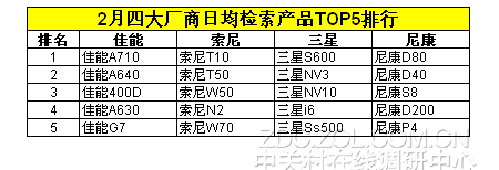 鉴于佳能、索尼、三星与尼康这四家厂商在整体数码相机市场垄断四分之三左右的市场份额,因而ZDC根据百度指数与ZOL关注调查,分别得出四大厂商日均检索两最高的五款产品与月度关注最高的五款产品排行榜。(注:由于百度与ZOL的用户及监测不同,因而产品数据排行榜不同)