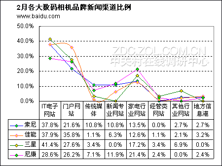 从百度新闻搜索指数上来看,这四大厂商首发新闻仍主要集中在IT电子网站。门户网站由于影响范围较大,且新闻涵盖点较多,因而在新闻渠道上也获得较高的比例。其中,值得一提的是佳能与尼康这两家厂商,二者首发新闻在IT电子类网站与门户网站悬殊较少,而较多产品线的索尼与三星这两大厂商在二类网站中出现较大的偏差。