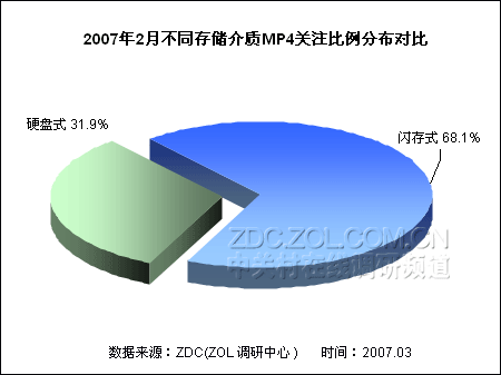 在ZDC的关注调查结果中显示,闪存式MP4仍是当前MP4市场上的主流产品,关注比例接近整体市场的七成,同比高出硬盘式MP4超过35个百分点。而同1月份相比,闪存式MP4关注比例提升了3个百分点左右。从这一比例来看,闪存式MP4保持了较快的增长速度,这决定了其在市场上普及较为广泛。