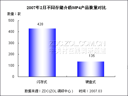 调查结果显示,当前市场上受到用户关注的闪存式与硬盘式MP4播放器产品数量悬殊较大,其中,受到关注的闪存MP4超过400款,而硬盘式MP4却不足150款。由此可见,产品数量的有限是硬盘式MP4在市场上的竞争力以及关注较低的重要因素。